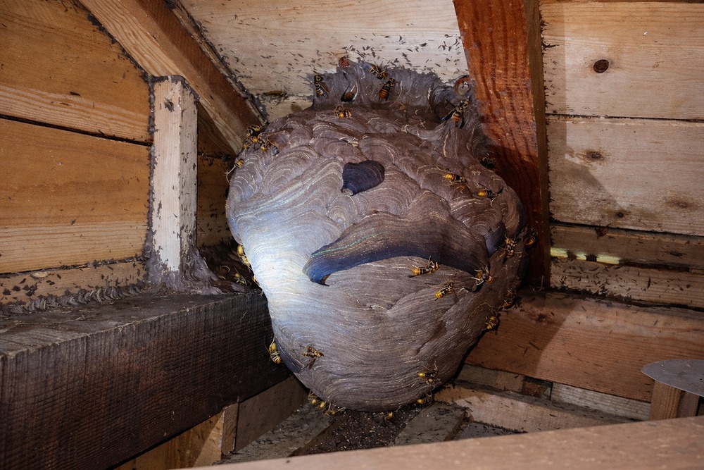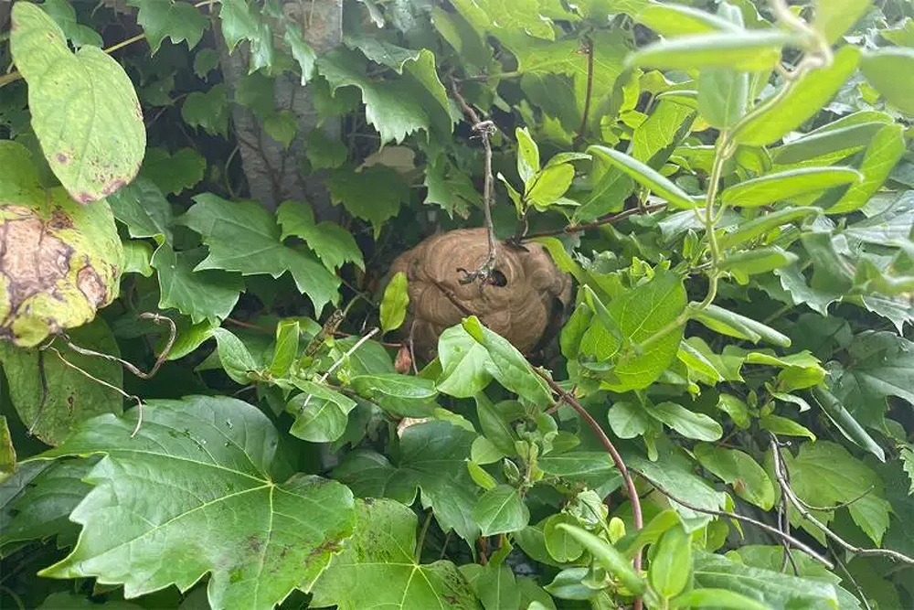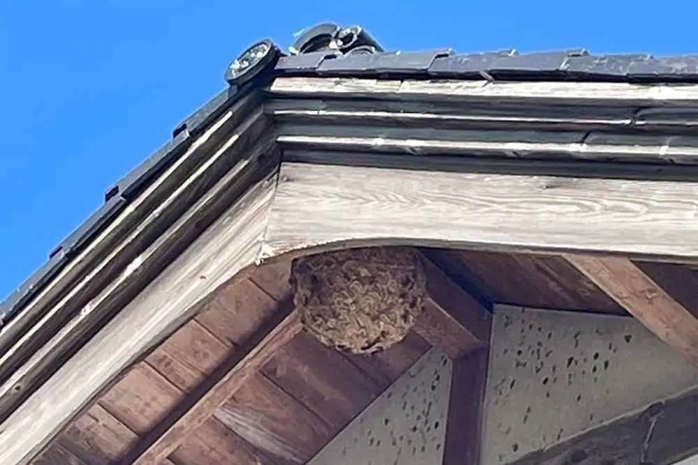 スズメバチは攻撃性が高く、刺激すると集団で襲ってくる危険があります。特に、軒下・屋根裏・庭木・物置など人目につきにくい場所に巣を作ることが多く、気づいたときには巣が大きくなっている場合もあります。